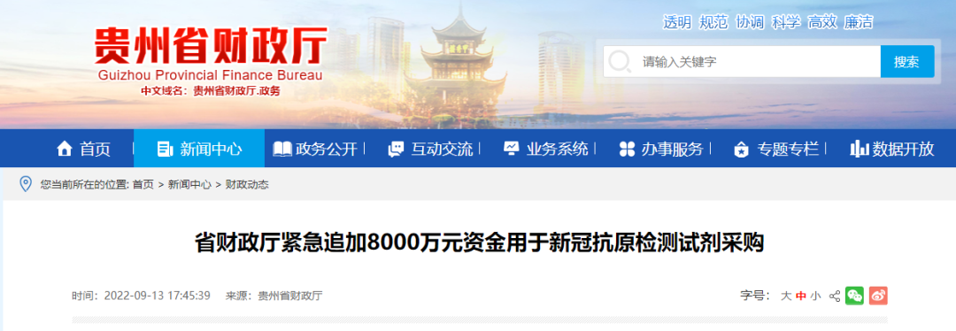 據(jù)貴州省財(cái)政廳公開(kāi)消息顯示,此前(9月7日)省財(cái)政廳緊急追加5000萬(wàn)元疫情防控醫(yī)藥物資儲(chǔ)備應(yīng)急采購(gòu)備用金,預(yù)算將下達(dá)至省糧食和物資儲(chǔ)備局,由省工業(yè)和信息化廳、省糧食和物資儲(chǔ)備局按照省應(yīng)對(duì)新冠肺炎疫情防控領(lǐng)導(dǎo)小組物資(醫(yī)藥)保障組指示和疫情防控需要,重點(diǎn)采購(gòu)急需的核酸檢測(cè)試劑、防護(hù)服、隔離衣、護(hù)目鏡等醫(yī)藥物資。