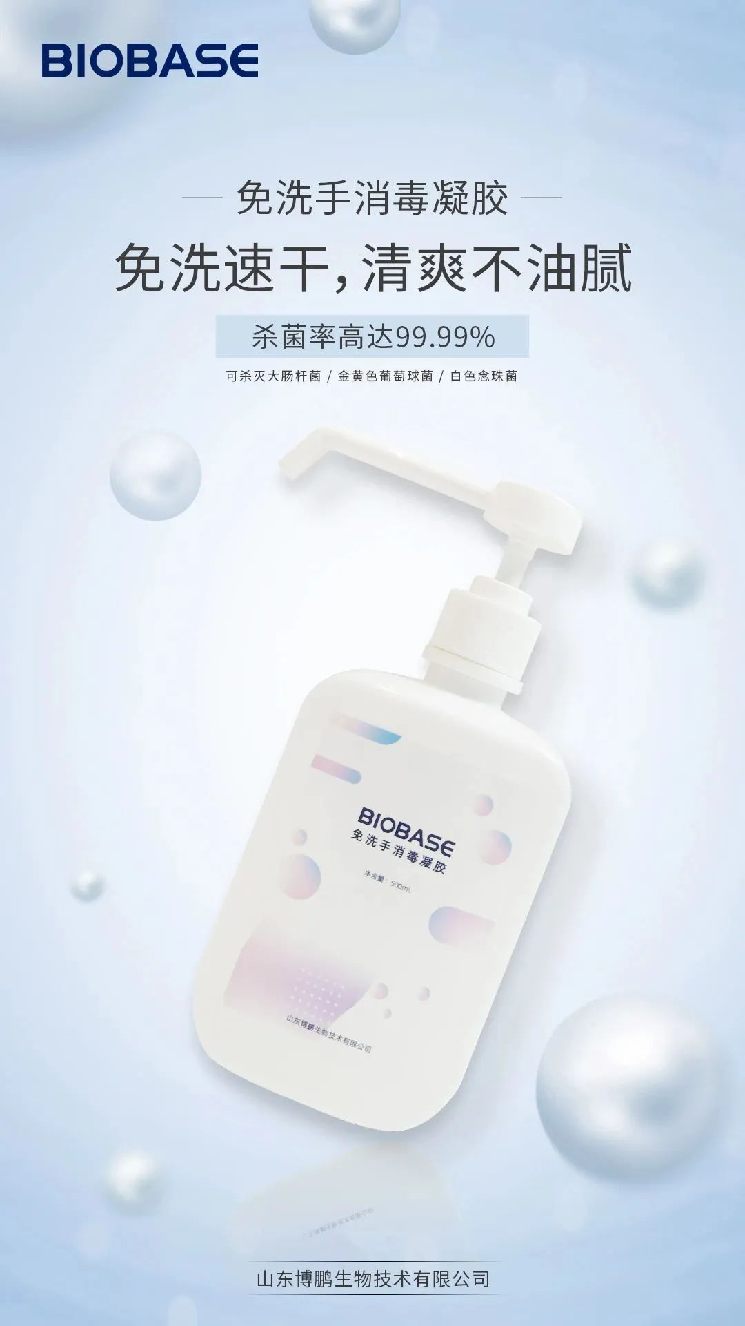 BIOBASE 免洗手消毒凝膠可殺滅大腸桿菌、金黃色葡萄球菌、白色念珠菌,免洗速干,殺菌率達(dá)到99.99%。