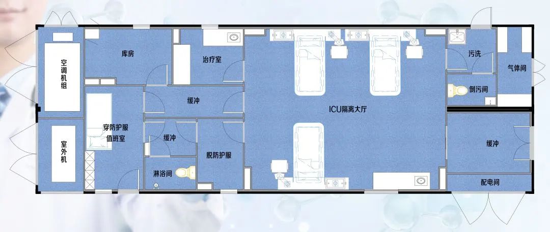 ICU雙體方艙嚴(yán)格按照規(guī)范標(biāo)準(zhǔn)建設(shè),符合規(guī)范流程??梢愿鶕?jù)客戶需求定制尺寸,支持應(yīng)急場景整體解決方案定制。