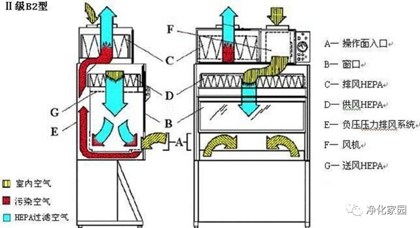 (2)B2型為100%全排型安全柜,無內(nèi)部循環(huán)氣流,柜內(nèi)氣流過濾后全部排入大氣,不再進(jìn)入安全柜循環(huán),可同時提供生物性和化學(xué)性的安全控制,如圖2。