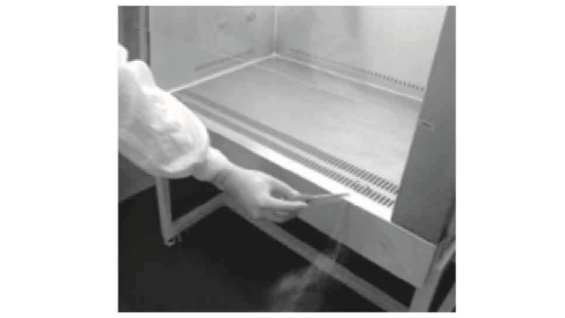 前窗操作口的流入氣流主要起到了對(duì)操作區(qū)的屏障作用,通過(guò)控制流入氣流的流速,有效的保障操作區(qū)內(nèi)的污染物不會(huì)逸出生物安全柜。通過(guò)氣流模式的驗(yàn)證,可以很直觀地判斷出下圖為典型的流入氣流不符合的狀況,如在此狀態(tài)下操作實(shí)驗(yàn),人員和環(huán)境均不被保護(hù)。