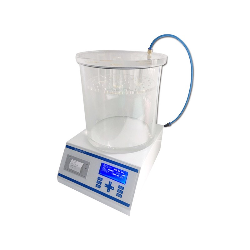 通過對(duì)真空室抽真空,使浸在水中的試樣產(chǎn)生內(nèi)外壓差,觀測(cè)試樣內(nèi)氣體外逸情況,以此判定試樣的密封性能;通過對(duì)真空室抽真空,使試樣產(chǎn)生內(nèi)外壓差,觀測(cè)試樣膨脹及釋放真空后試樣形狀恢復(fù)情況,以此判定試樣的密封性能。