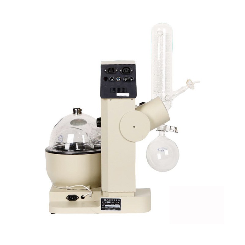 蒸發(fā)瓶恒速旋轉(zhuǎn),水浴鍋恒溫加熱,在此條件下:物料在蒸發(fā)瓶內(nèi)壁形成大面積均勻薄膜快速蒸發(fā),在真空條件下可以提高蒸發(fā)效率(需連接真空裝置),溶媒蒸汽經(jīng)玻璃冷凝盤管時冷卻成液體(需連接冷卻裝置),回收于收集瓶。