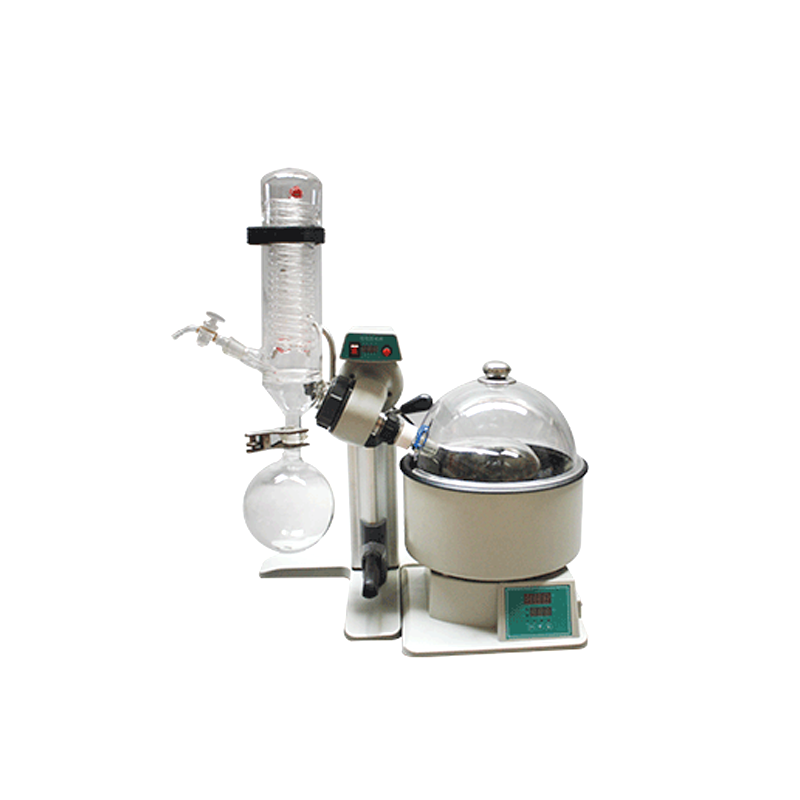 蒸發(fā)瓶恒速旋轉(zhuǎn),水浴鍋恒溫加熱,在此條件下:物料在蒸發(fā)瓶?jī)?nèi)壁形成大面積均勻薄膜快速蒸發(fā),在真空條件下可以提高蒸發(fā)效率(需連接真空裝置),溶媒蒸汽經(jīng)玻璃冷凝盤管時(shí)冷卻成液體(需連接冷卻裝置),回收于收集瓶。