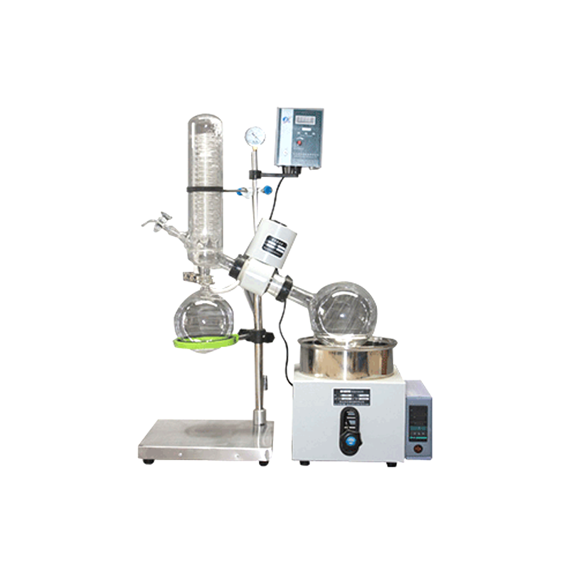 蒸發(fā)瓶恒速旋轉(zhuǎn),水浴鍋恒溫加熱,在此條件下:物料在蒸發(fā)瓶內(nèi)壁形成大面積均勻薄膜快速蒸發(fā),在真空條件下可以提高蒸發(fā)效率(需連接真空裝置),溶媒蒸汽經(jīng)玻璃冷凝盤管時(shí)冷卻成液體(需連接冷卻裝置),回收于收集瓶。